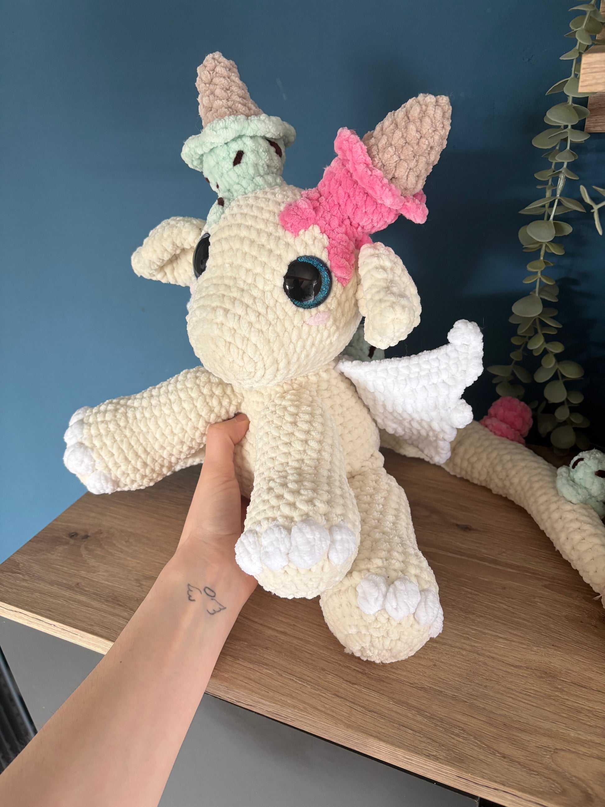 Dieser süße Eiscreme-Drache ist ein echtes Einzelstück! Mit seinen liebevoll gehäkelten Hörnern in Eistüten-Optik, großen Glitzeraugen und flauschigen Flügeln verzaubert er Klein und Groß.